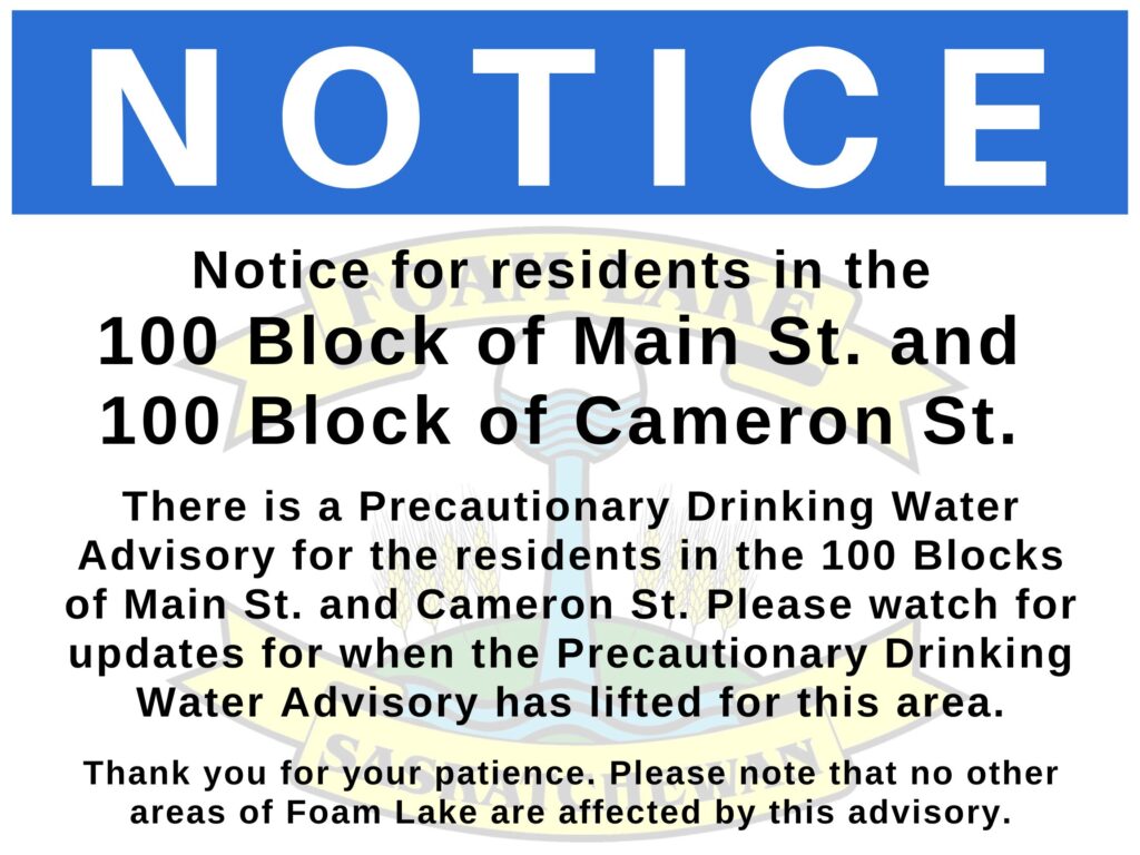 Notice – Water Main Break & Precautionary Drinking Water Advisory for areas of Foam Lake