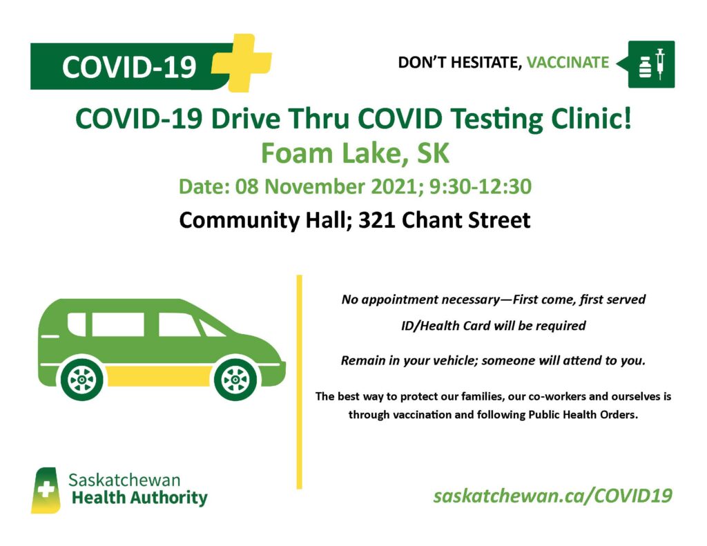 There will be a Covid-19 Drive Thru testing clinic on Monday, November 8, 2021 from 9:30 am – 12:30 pm at the Foam Lake community Hall.