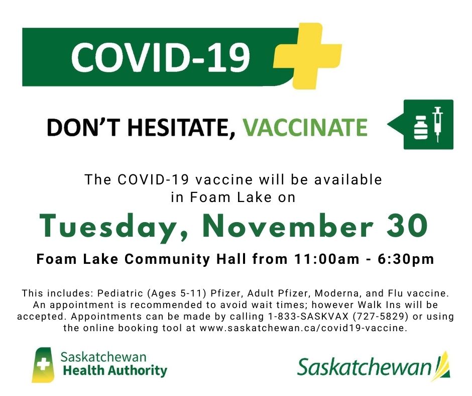 An appointment is recommended to avoid wait times; however Walk Ins will be accepted. Appointments can be made by calling 1-833-SASKVAX (727-5829) or using the online booking tool at www.saskatchewan.ca/covid19-vaccine.