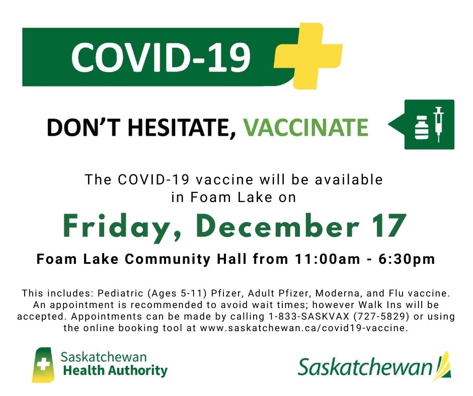The COVID-19 vaccine will be available on Fridayday, December 17 at Foam Lake Community Hall—11:00-6:30pm (321 Chant Street, Foam Lake, SK)