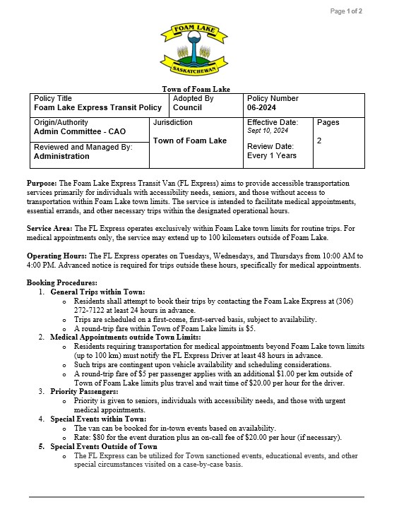 The Town of Foam Lake offers transit services through the Foam Lake Express Handi-Van, providing safe and dignified transportation for those with limited mobility or other physical needs.